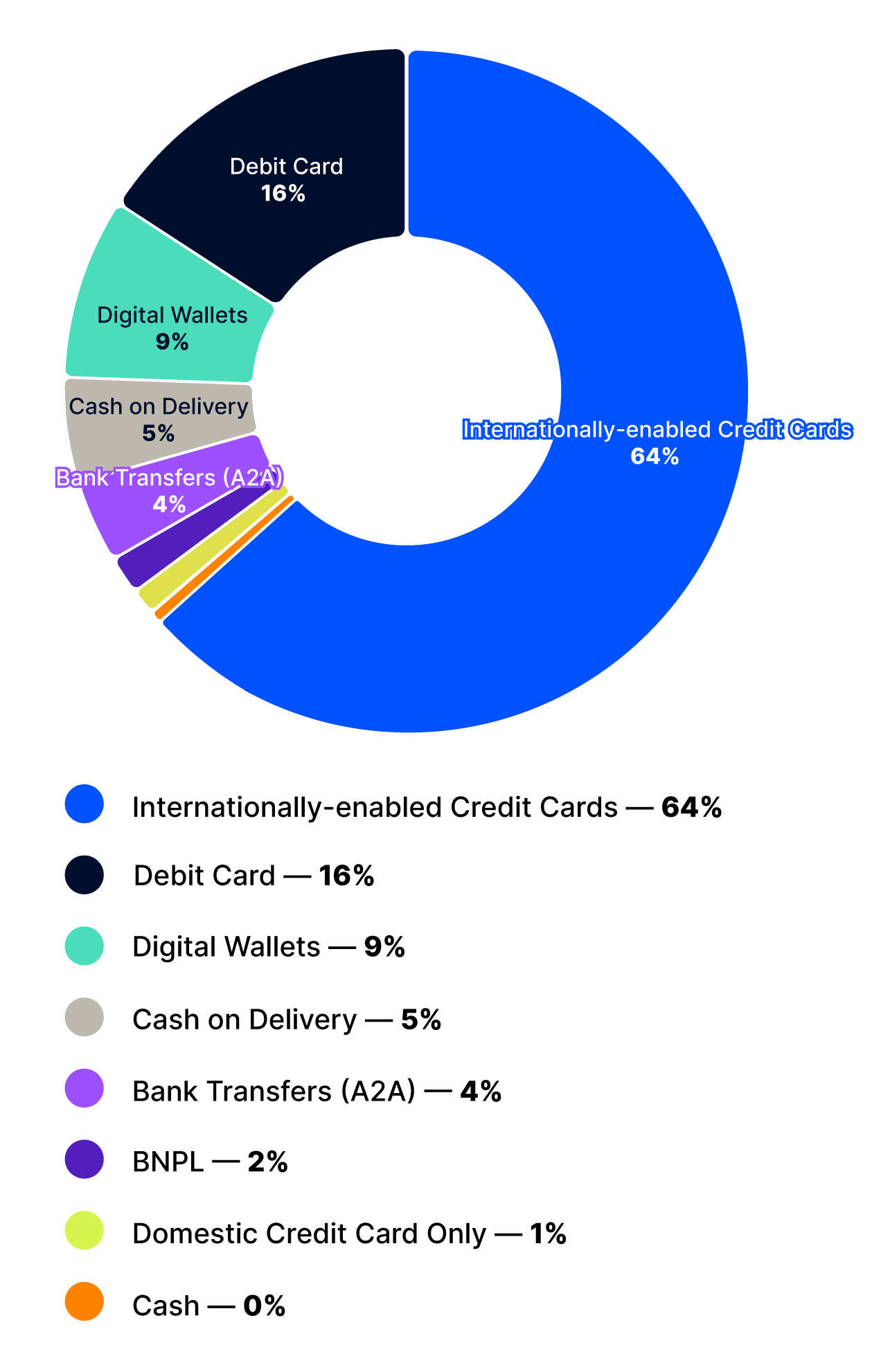 Turkey is a card-led digital commerce market, with internationally enabled credit cards representing the majority of online transactions today. At the same time, bank transfers and digital wallets are steadily growing, reinforcing Turkey’s transition toward a hybrid payments ecosystem.